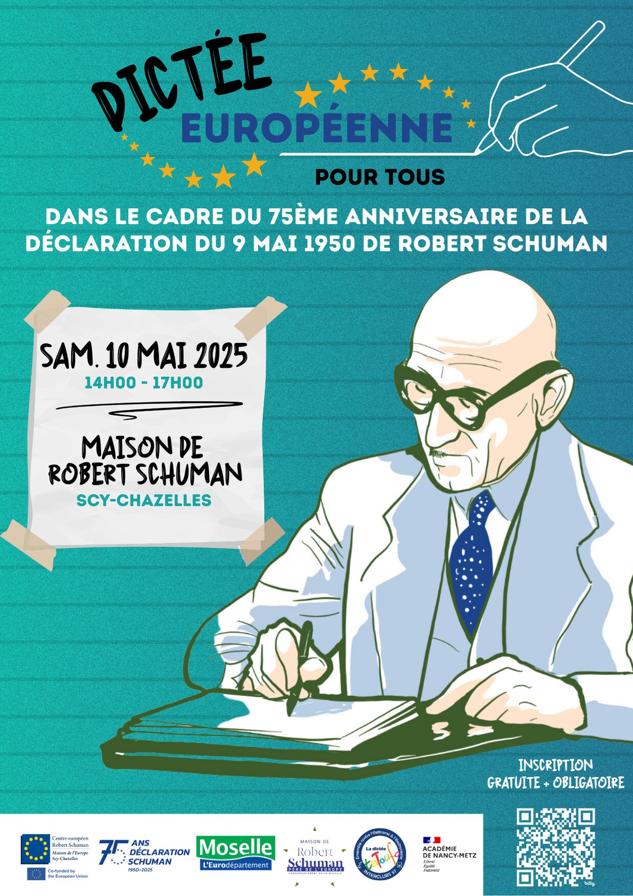 Dans le cadre des célébrations du 75e anniversaire de la Déclaration du 9 mai 1950 de Robert Schuman, le CERS, en partenariat avec la Maison de Robert Schuman, l’Eurodépartement de la Moselle, le collectif INTERCLUBS 57 – Tatoufo, et le Rectorat de Nancy-Metz, a le plaisir de vous inviter à participer à la dictée européenne pour tous. Cet événement se déroulera le samedi 10 mai à partir de 14h00 à la Maison de Robert Schuman à Scy-Chazelles.