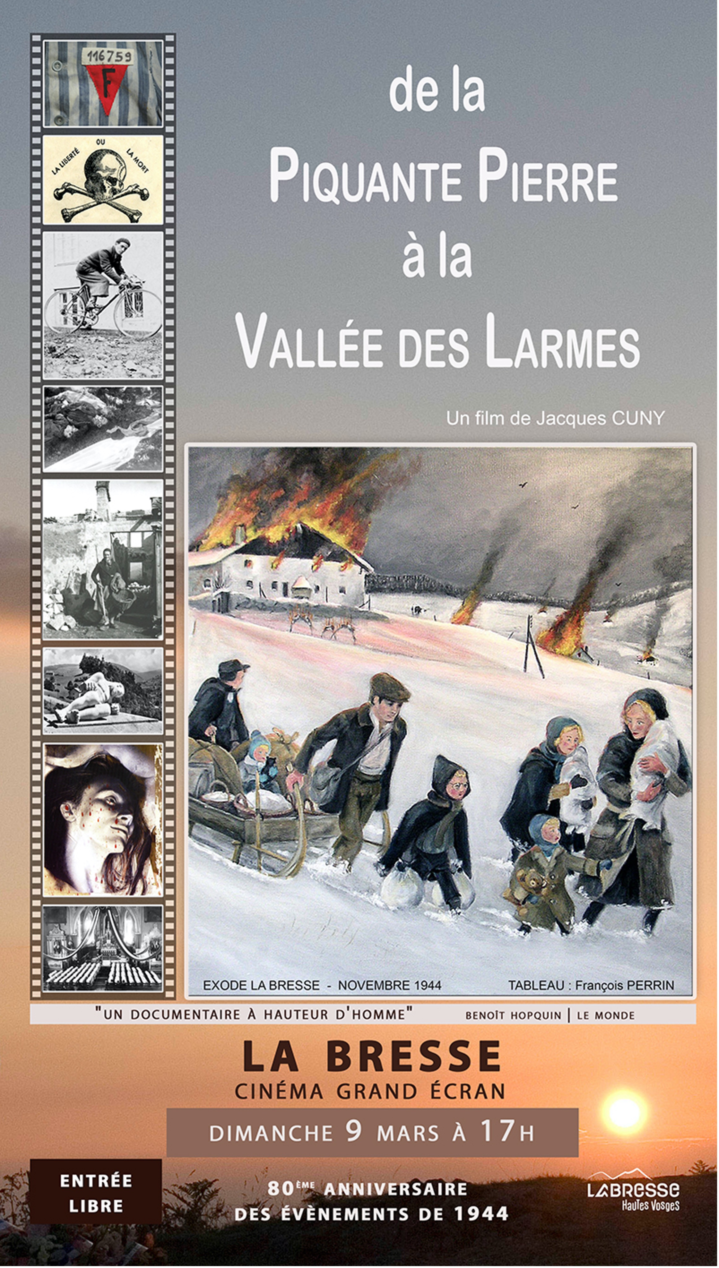 A l’invitation du Cinéma Grand Ecran de La Bresse, en écho au 80ème anniversaire des évènements de 1944, Jacques Cuny présentera son film « De la Piquante Pierre à la vallée des larmes » à LA BRESSE, le dimanche 9 mars à 17heures