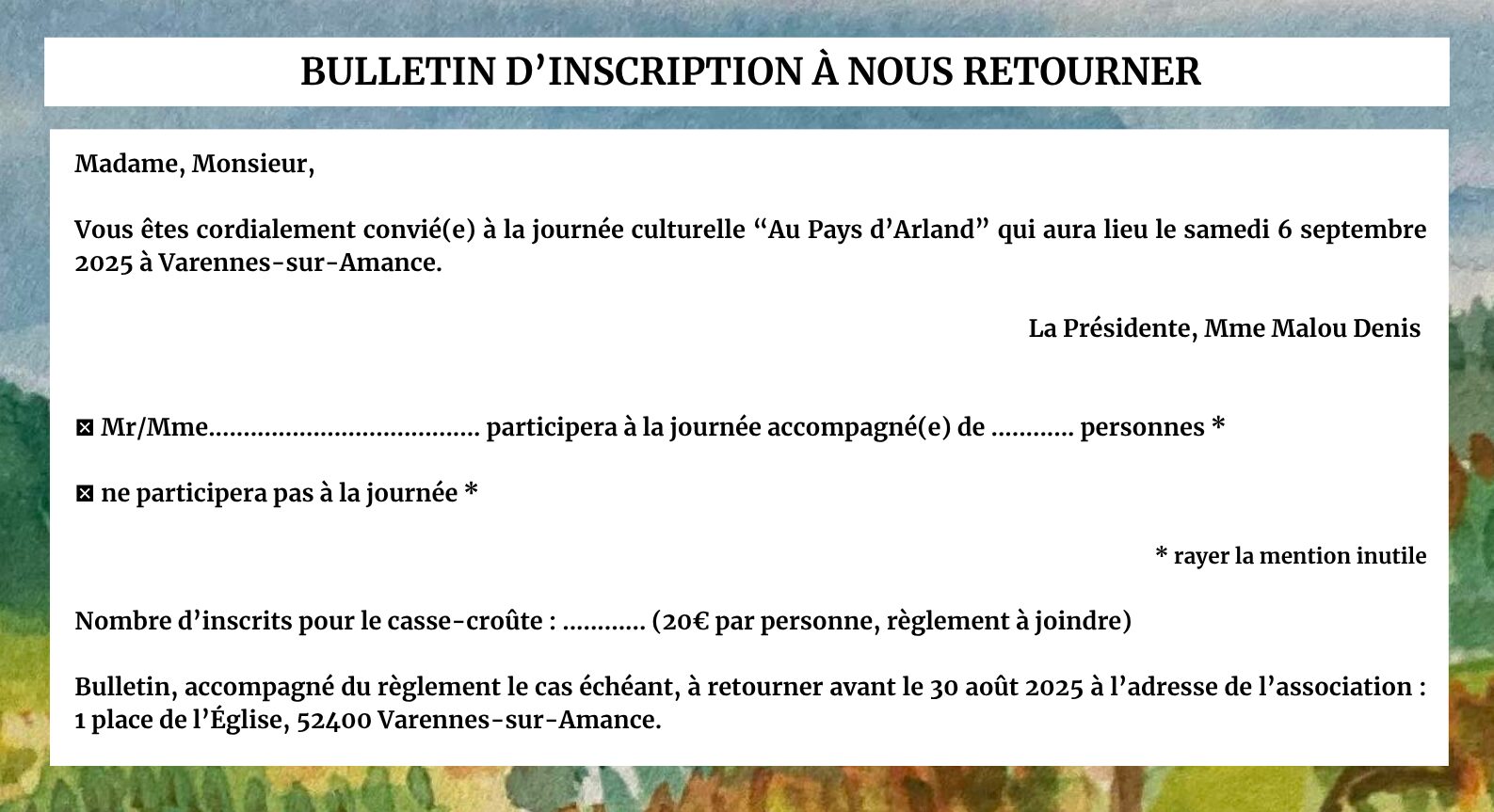 Inscription au casse-croûte obligatoire avant le 30 août au 06 88 50 01 12 ou à malou52denis@hotmail.fr règlement lors de la réservation à l’ordre de l’association Au Pays d’Arland