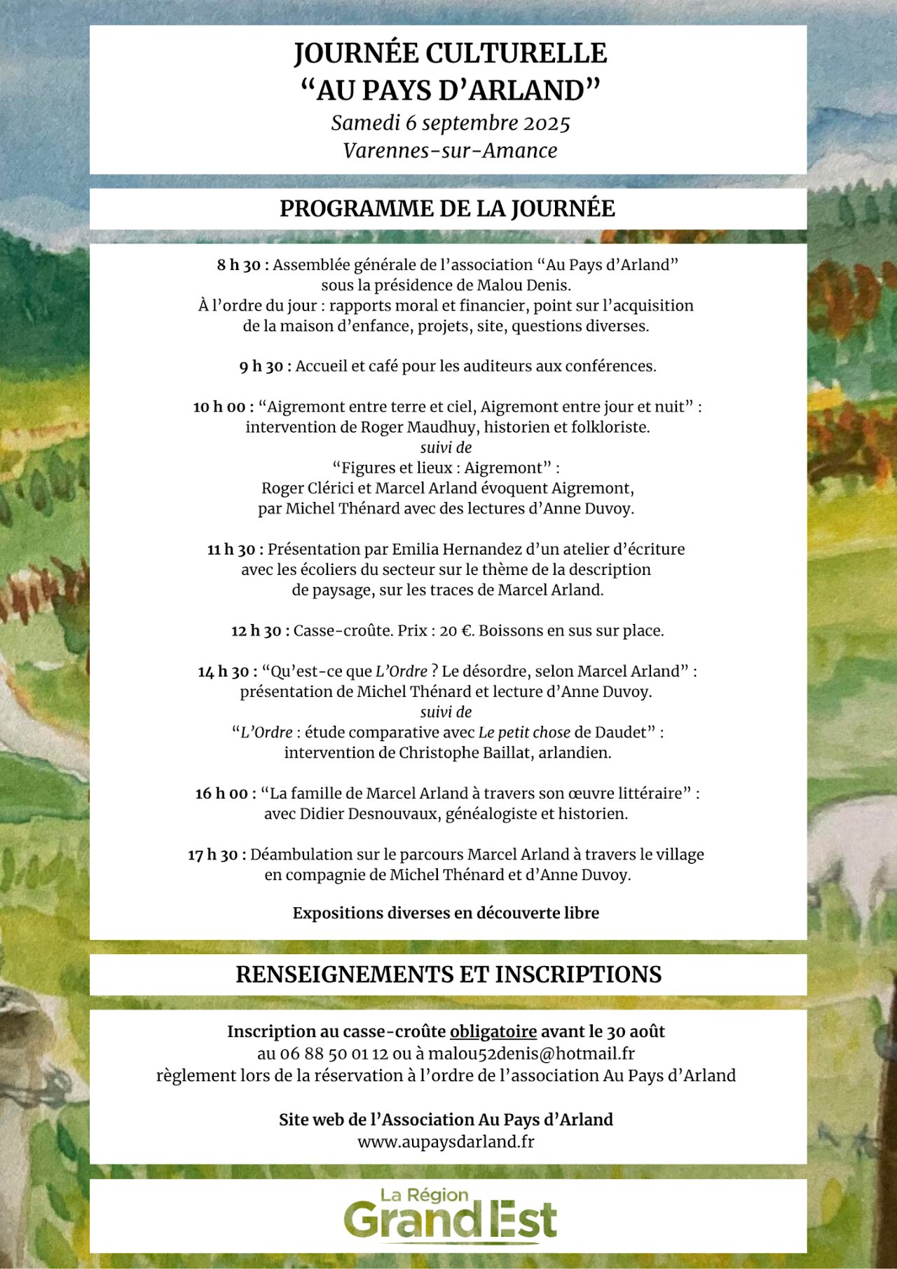 L’association Au pays d’Arland est une association composée de riverains et de passionnés réunis autour de la mémoire et de l’œuvre de Marcel Arland, écrivain majeur du XXᵉ siècle et figure emblématique de Varennes-sur-Amance. Portée par une équipe de bénévoles engagés, notre association a pour mission de faire vivre et rayonner l’héritage littéraire et culturel de cet auteur, en organisant des événements, des rencontres, et des actions de valorisation du patrimoine local. Enracinés dans le territoire, nous œuvrons à faire découvrir ou redécouvrir l’univers d’Arland et à inscrire durablement sa présence dans la vie culturelle du village et de ses alentours.