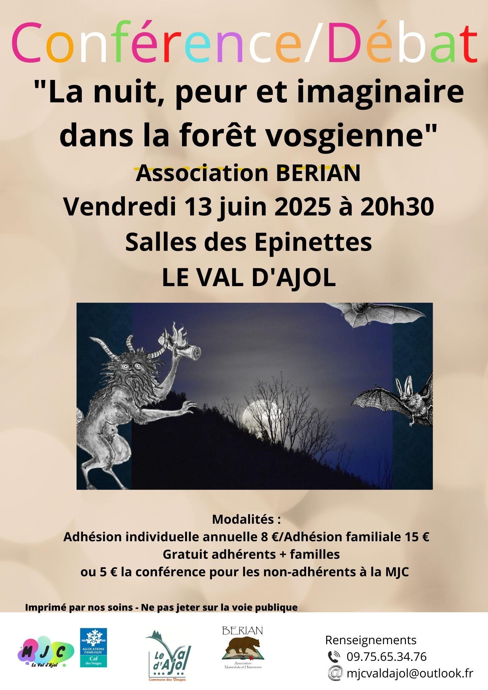 Lors de cette soirée, notre association présentera une conférence diaporama sur le sujet de la forêt vosgienne la nuit et des inquiétudes qu’elle a pu engendrer au cours du temps. Nous y découvrirons des créatures entre le réel et l’imaginaire à l’image du Houéran la créature hurlante mi-homme mi-bouc qui puise son inspiration dans l’oiseau nocturne, le Hibou Grand-duc.