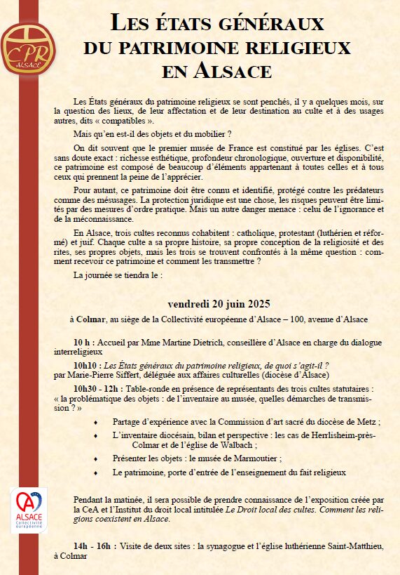 Pendant la matinée, il sera possible de prendre connaissance de l’exposition créée par la CeA et l’Institut du droit local intitulée Le Droit local des cultes. Comment les religions coexistent en Alsace.