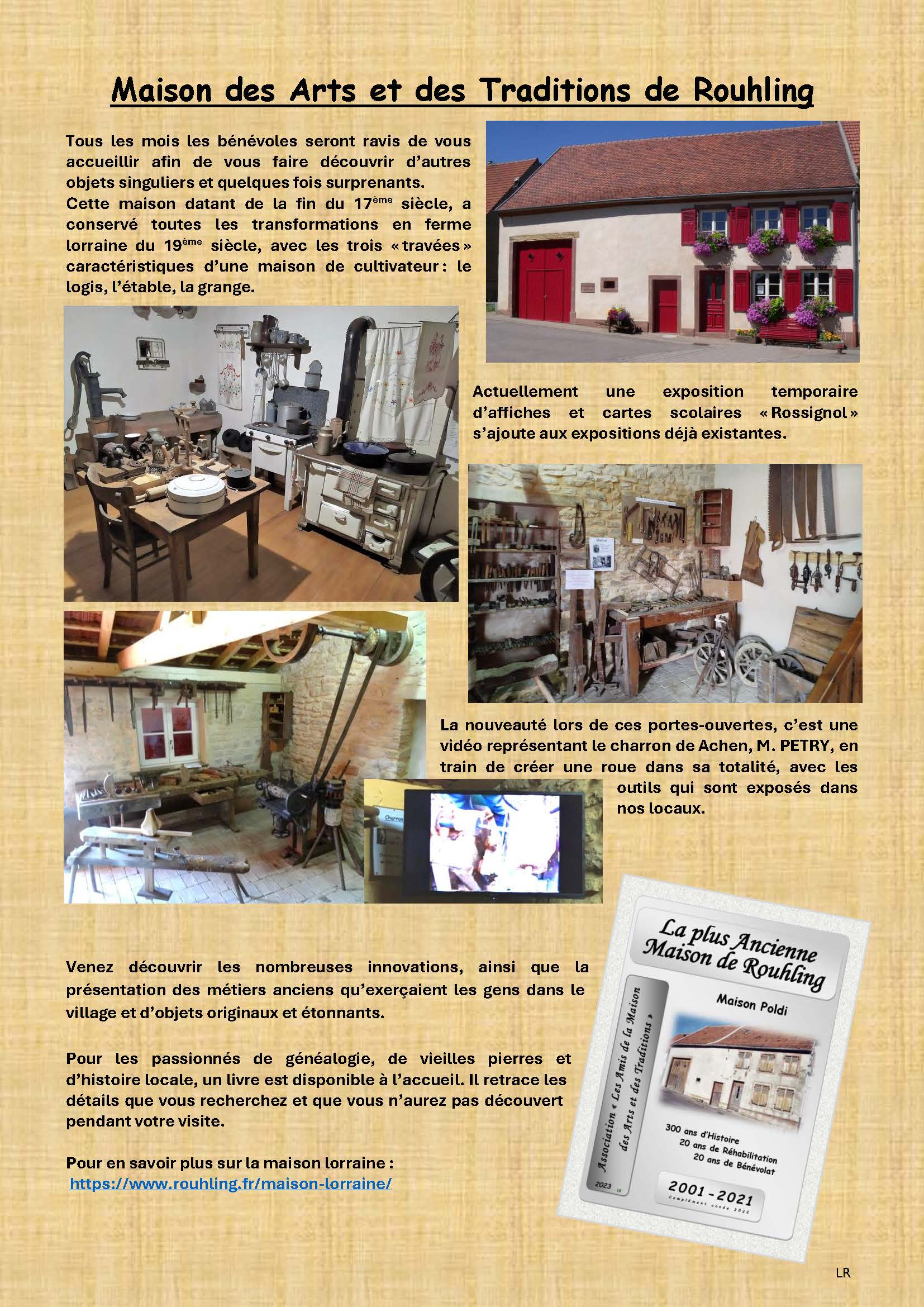 Les bénévoles passionnés, seront ravis de vous faire découvrir le résultat de leur travail de 20 ans de réhabilitation d’une maison lorraine, ainsi que les présentations et mise en valeur d’objets, matériels, machines et diverses expositions.