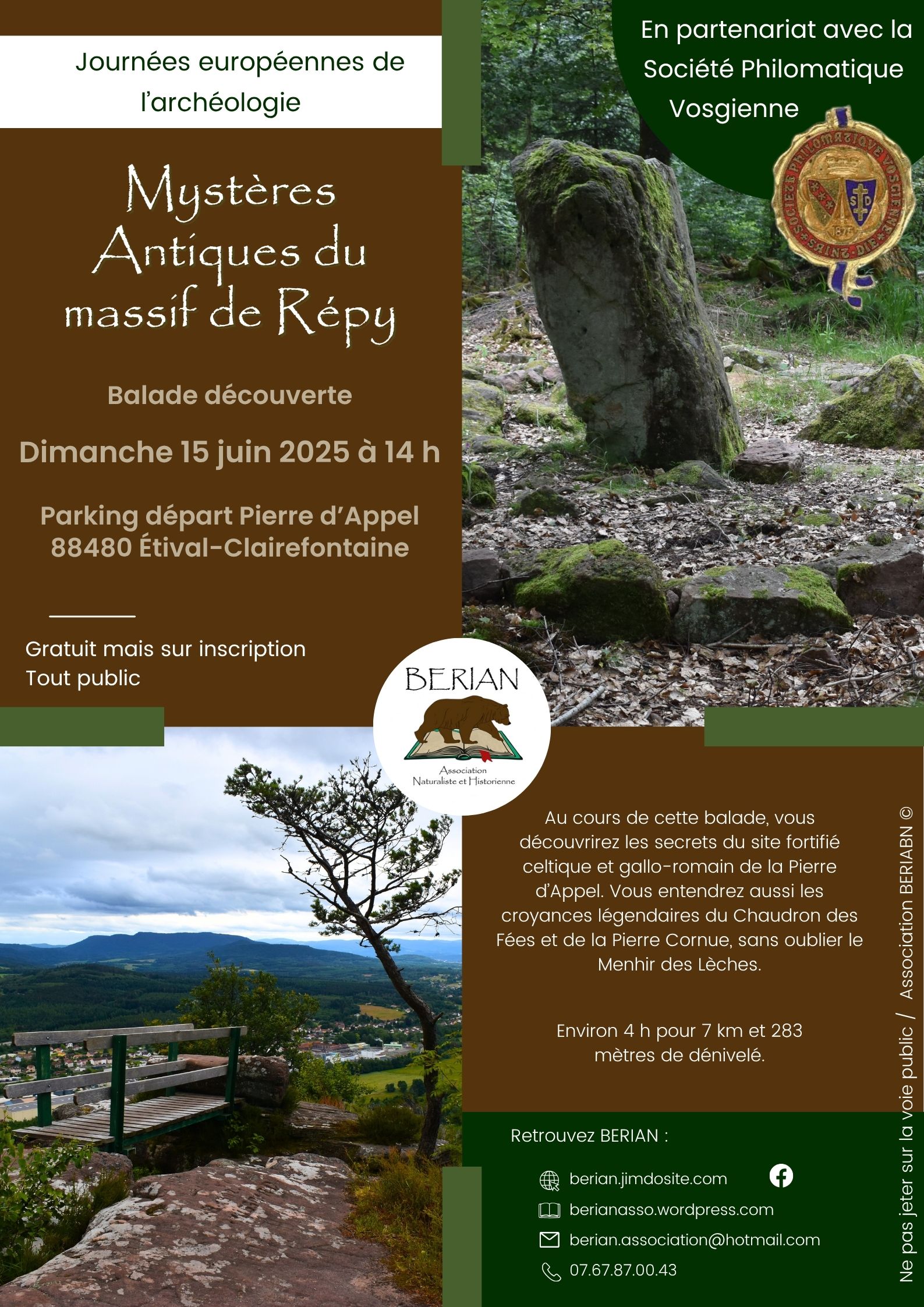 Cette sortie vous est proposée par la Société Philomatique Vosgienne et BERIAN – Association Naturaliste et Historienne dans le cadre des Journées européennes de l’archéologie.